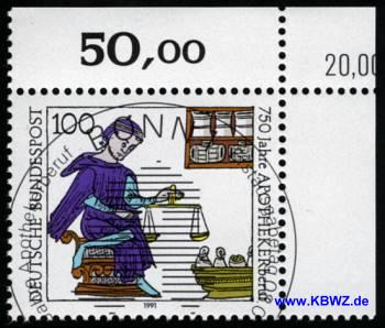KBWZ Bund 1991, Michel-Nr.: 1490 mit Sonderstempel BONN 8. Januar 1991: "750 Jahre Apothekerberuf" Eckrandstück rechts oben mit korrigiertem Bogenwertzudruck (KBWZ) "20,00" D-Mark. Briefmarke in einwandfreiem Zustand mit voller Gummierung, ungefaltet. Echtheitsgarantie. Selten angeboten!