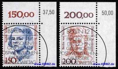 KBWZ Bund 1991, Michel-Nr.: 1497-98 mit Sonderstempel BERLIN 14. Februar 1991: Dauerserie "Frauen der dt. Geschichte" 150 und 200 Pf Eckrandstücke rechts oben mit korrigiertem Bogenwertzudruck (KBWZ) “37.50” und "50,00" D-Mark. Beide Briefmarken in einwandfreiem Zustand mit voller Gummierung, ungefaltet. Echtheitsgarantie. Selten angeboten!