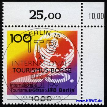KBWZ Bund 1991, Michel-Nr.: 1495 mit Sonderstempel BERLIN 8. Januar 1991: "Internationale Tourismusbörse (ITB), Berlin" Eckrandstück rechts oben mit korrigiertem Bogenwertzudruck (KBWZ) "6,00" D-Mark. Briefmarke in einwandfreiem Zustand mit voller Gummierung, ungefaltet. Echtheitsgarantie. Selten angeboten!