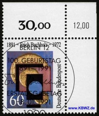 KBWZ Bund 1991, Michel-Nr.: 1493 mit Sonderstempel BERLIN 8. Januar 1991: "100 Geburtstag von Erich Buchholz" Eckrandstück rechts oben mit korrigiertem Bogenwertzudruck (KBWZ) "12,00" D-Mark. Briefmarke in einwandfreiem Zustand mit voller Gummierung, ungefaltet. Echtheitsgarantie. Selten angeboten!