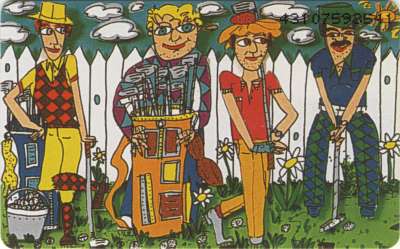 Die Karte zeigt das 3D-Bild 'FABULOUS FOURSOME' von James Rizzi aus dem Jahre 1990. Vier Golfspieler nebeneinander. Die 3D-Grafik hatte eine Auflage von 350 Stück.